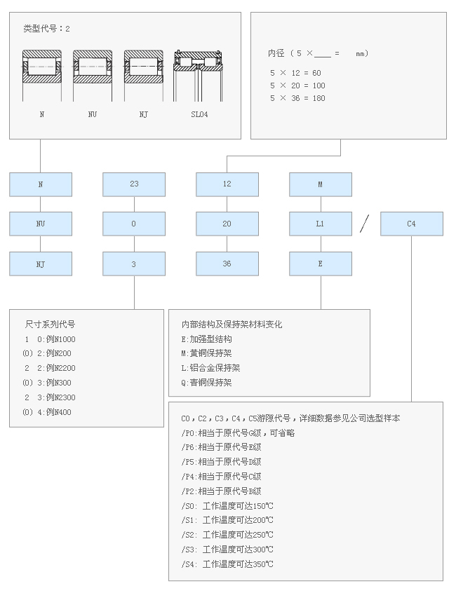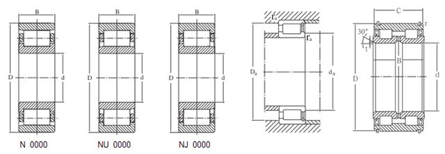 性能特點 a、轉(zhuǎn)速比相同外形尺寸的球軸承低 b、精度較高 c、噪音、振動較低 d、主要承受徑向載荷 e、內(nèi)、外圈均帶擋邊的可以承受較小的軸向載荷 雙列滿裝圓柱滾子軸承性能特點